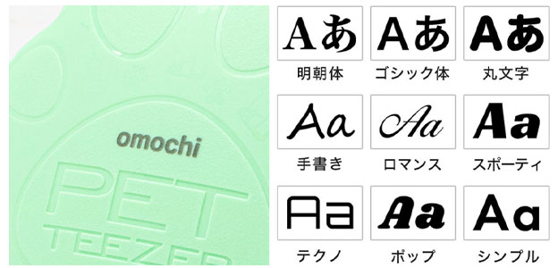 テキストは自由入力(アイテムによってことなります)、フォントは個性ある9種類からお選びいただけます。
