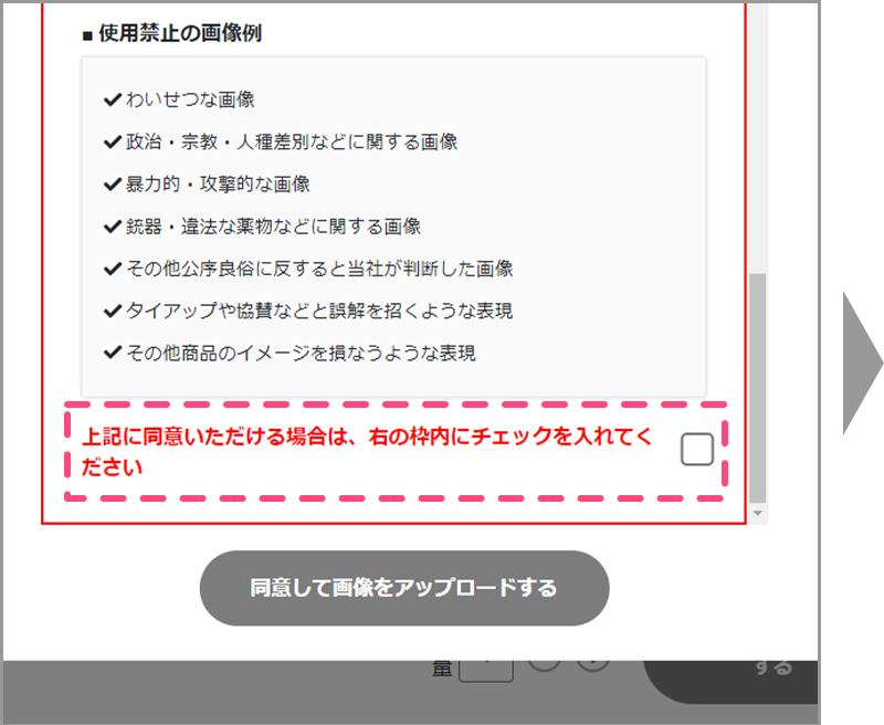 「画像を選択する」ボタンを押して「ご注意とお願い」の内容を確認の上、同意のチェックを入れ画像をアップロードしてください。