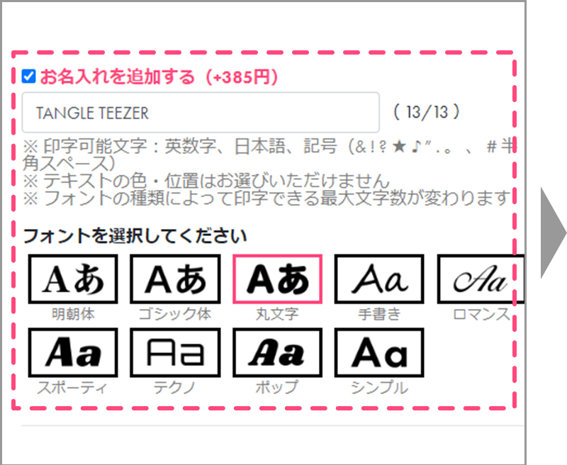 お名入れを追加する場合は、チェックを入れ、テキストとフォントをお選びください。